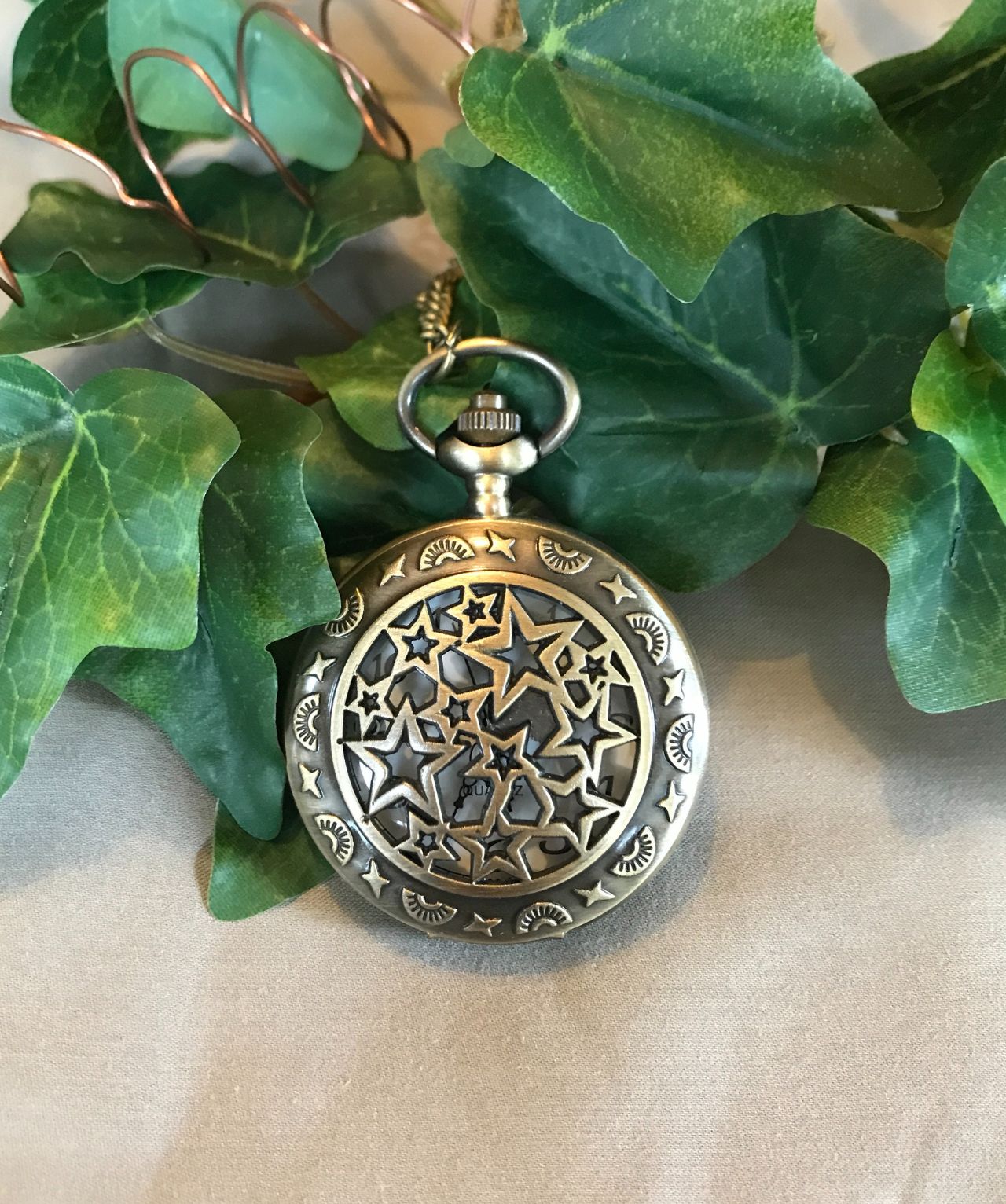 Et flot bronzefarvet lommeur med fine stjerner, som giver et lille kig ind til urskiven. Urskiven har klassiske arabiske tal. Uret sidder i en halskæde og er nem at tage af og på.