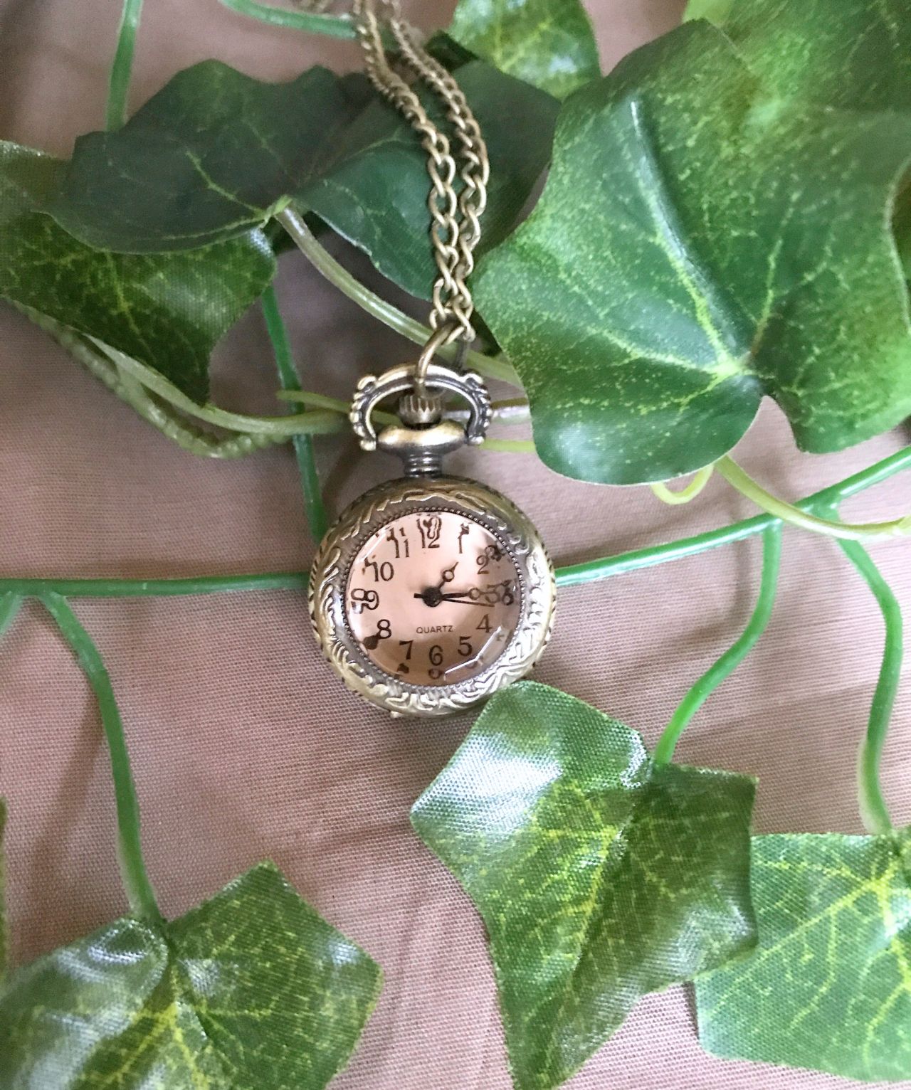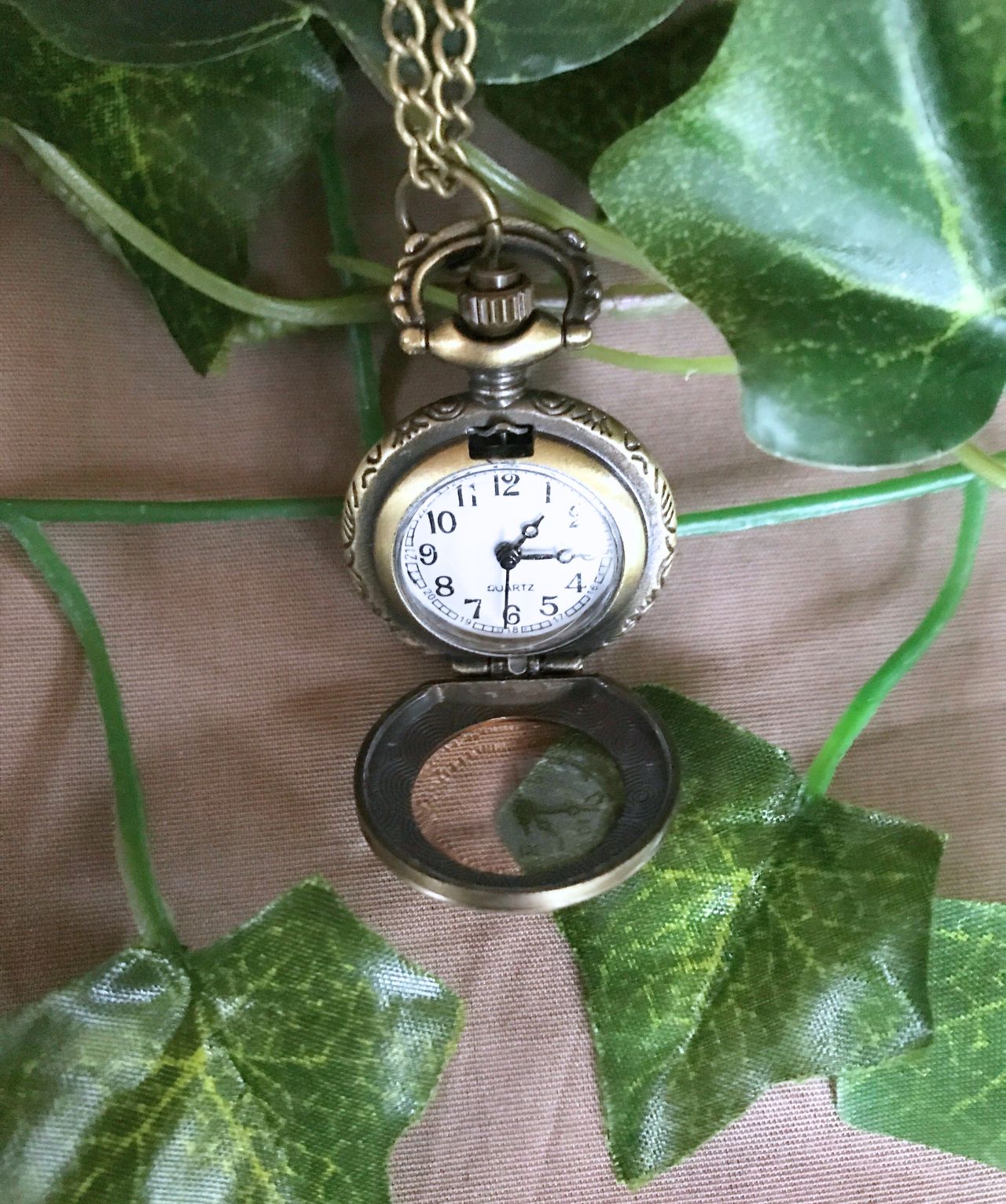 Minilommeur med gennemsigtig front, som har en let farvetone og en diamantagtig form. Uret sidder i en halskæde og er nemt at tage af og på.